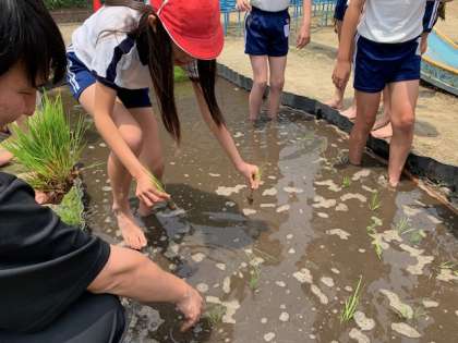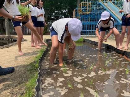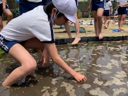 昨日の雨天から打って変わった好天の今日、5年生は田植えを行いました。