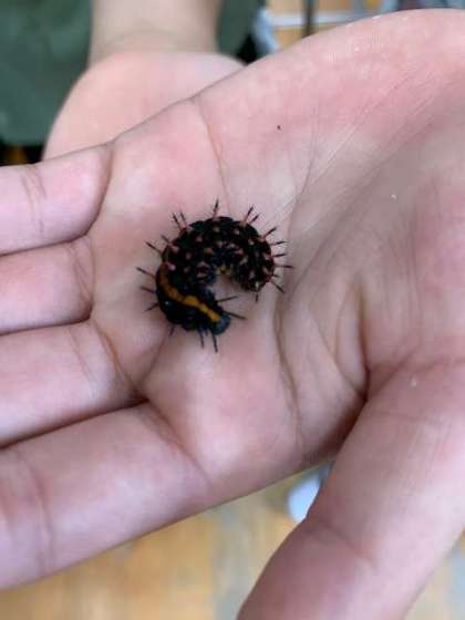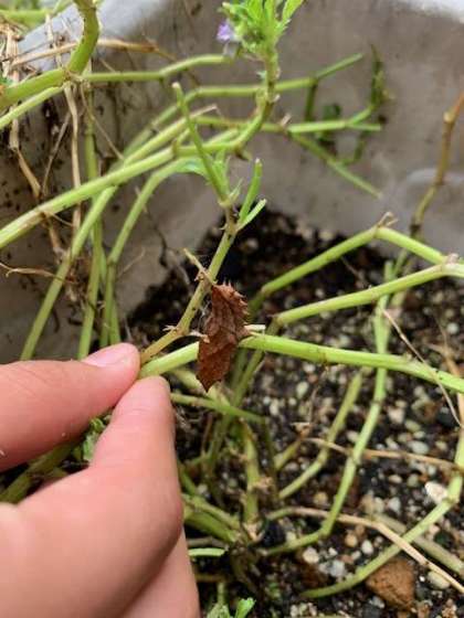 今週の月曜日に見つけて、逃がしてあげたツマグロヒョウモンの幼虫が、サナギになっているとの情報が子どもから入りました。
