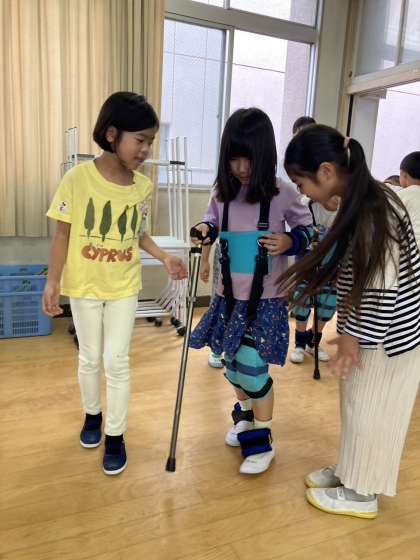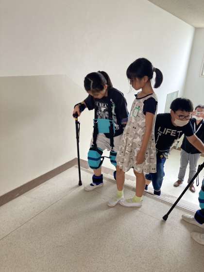 今日は阿倍野区社会福祉協議会のご協力のもと、子どもたちは体の各所に細工をして、高齢者の歩行困難な状況を体感しました。