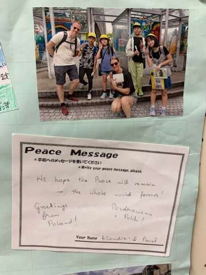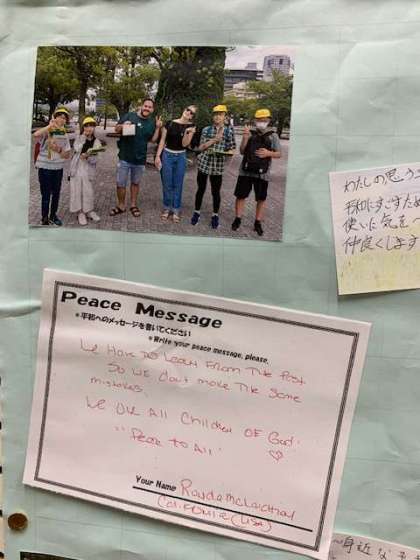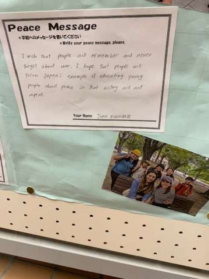 先月の修学旅行で訪れた広島平和記念公園で外国人の方々に書いていただいたピースメッセージが、玄関に登場しました。