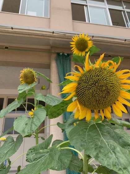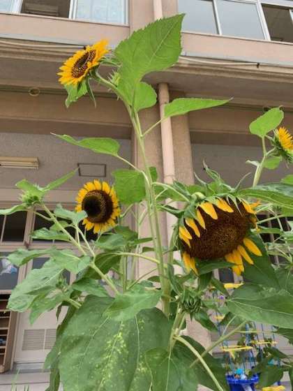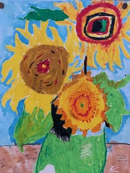 3年生が描いたゴッホの模写と学校のヒマワリ。