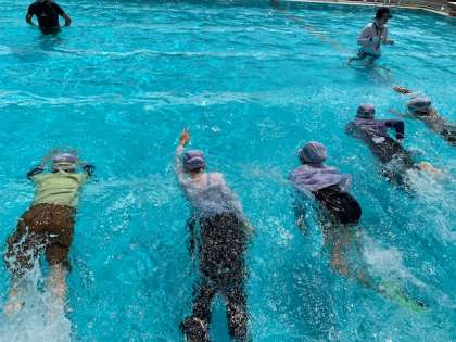 5年生と6年生は着衣泳をしました。(写真は6年生)