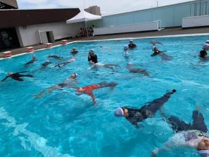 まずは、服を着たままだと泳ぎ辛いことを実感。