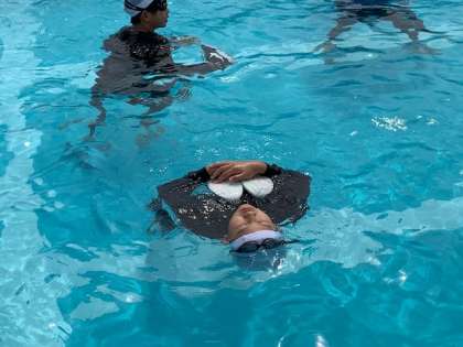 次に、実際に水難事故に遭遇したことを想定し、救助が来るまでの間は、浮いて待つということを体験。