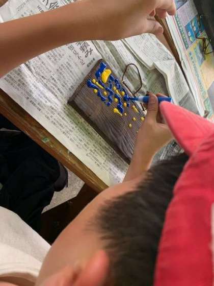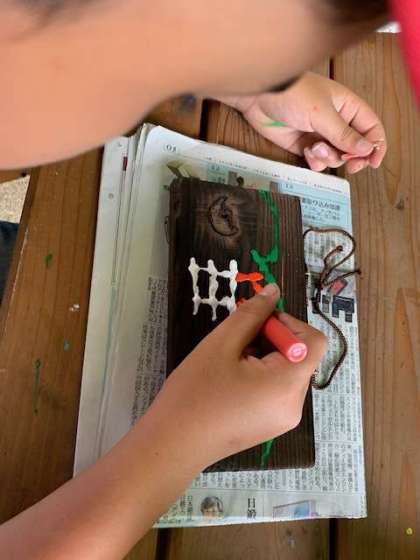 焼き板工作の仕上げ作業。