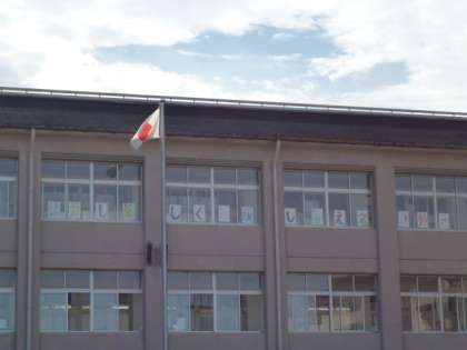 運動会のめあてが決まったので、児童朝会で紹介されました。今年のめあては「協力し楽しく応援し合える運動会」です。3階の窓に掲示されています。
