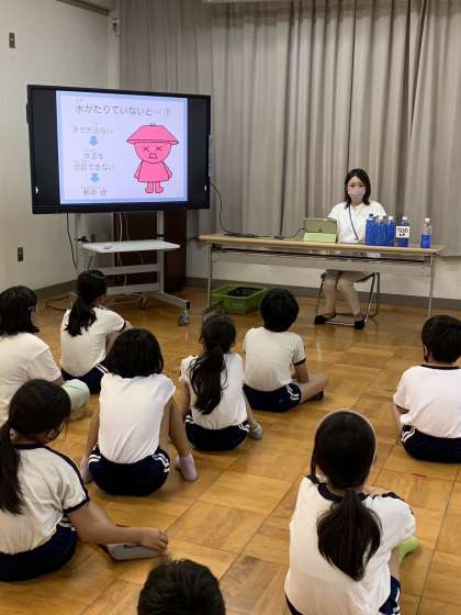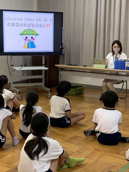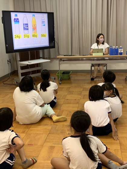 測定前に保健の先生から、熱中症予防についてと、ジュースに入る糖分の量についてのお話がありました。