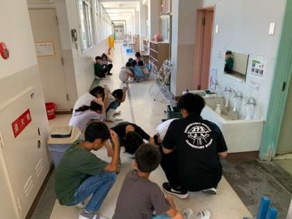 いつ起こるか分からない大地震への対応として、掃除時間中に地震があった時には、まず、自分の頭を守ること、そしてガラスから離れてしゃがみ姿勢をとること。