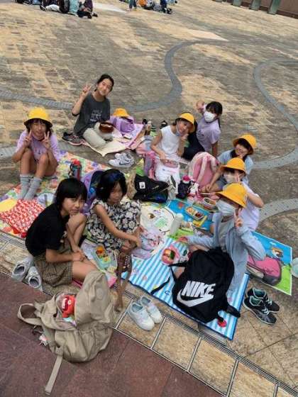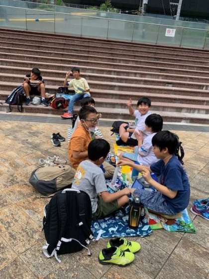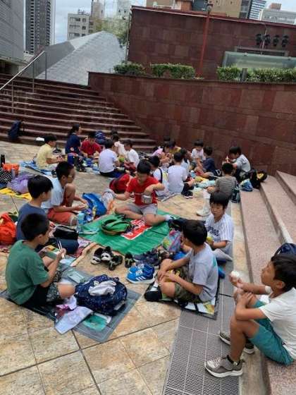 待望のランチタイム。今日は、少し風もあり涼しいです。科学館の前で食べてます。