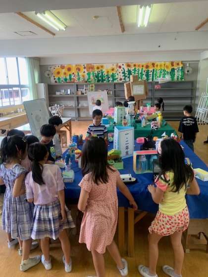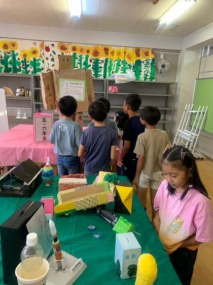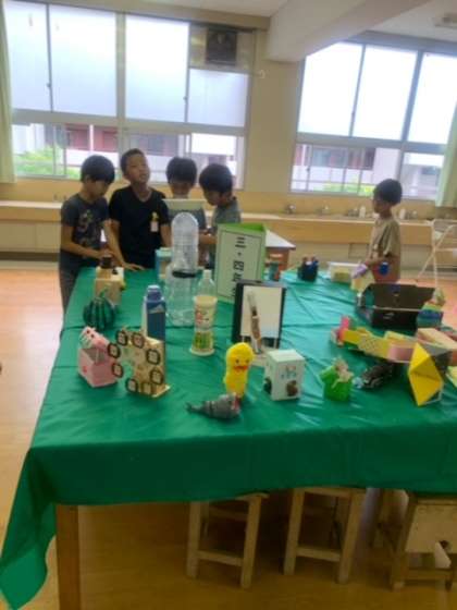 夏休みに子どもたちが作った作品を、学年ごとに図工室で展示しています。