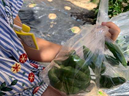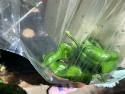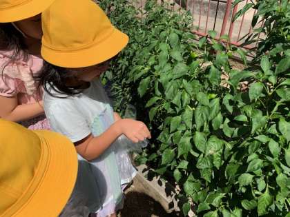 休み時間、賑やかな声がするので覗いて見ると、2年生が学習園で野菜を収穫していました。