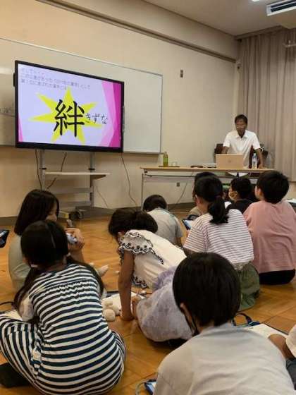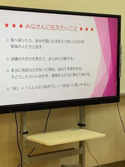 平池さんは、ご自身の経験を通じて感じた津波の恐ろしさや命の大切さ、助け合っていく絆の尊さ=思いやりの心について、たくさんのスライドと共に子ども達に伝えてくださいました。