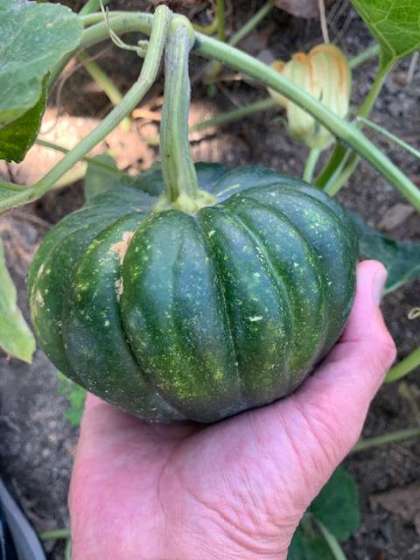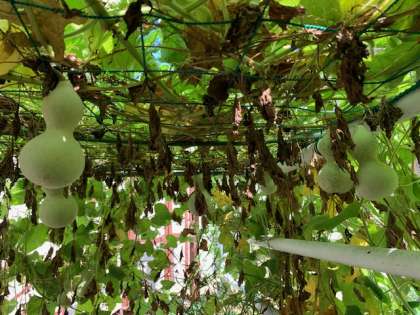 暑ーい日、雨の多い日が幸いしたのか、今年のヘチマやひょうたんやかぼちゃは、どれも大ぶりです。