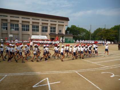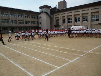 1時間目に運動会の全体練習をしました。開会式の練習で入場行進をした後、運動会の歌、ちかいの言葉の練習をしました。