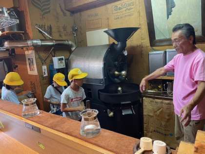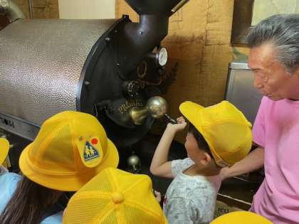 コーヒー豆の焙煎機を持ち上げさせてもらったり、豆を触らせてもらったりしました。