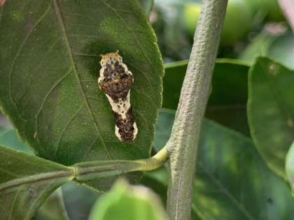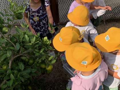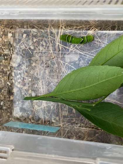 教室で飼っているアゲハの幼虫の餌を取りにきた1年生。