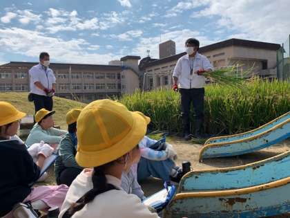 今日もJAの方々にお越しいただき、稲刈りイロハのレクチャーを受け、学年総出で稲を刈りました。