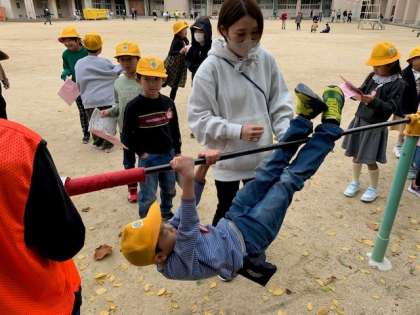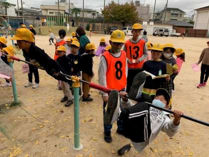 鉄棒技の認定チェックのお手伝いをするのは、6年生の委員会のメンバーたち。