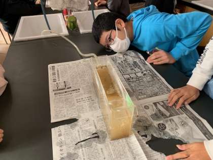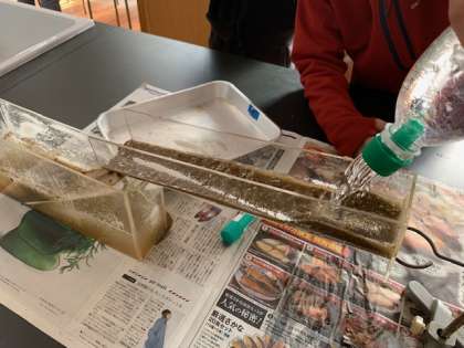 今日は土と水と水槽を使い、地層を作ってみました。