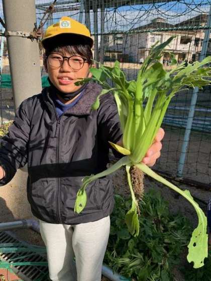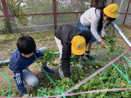 間引きが甘かったせいか、ホウレンソウとチンゲンサイで埋め尽くされた学習園。