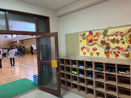 管理作業員さんが講堂の入り口に靴箱を備えてくださいました。
