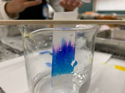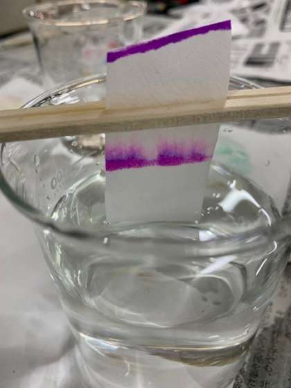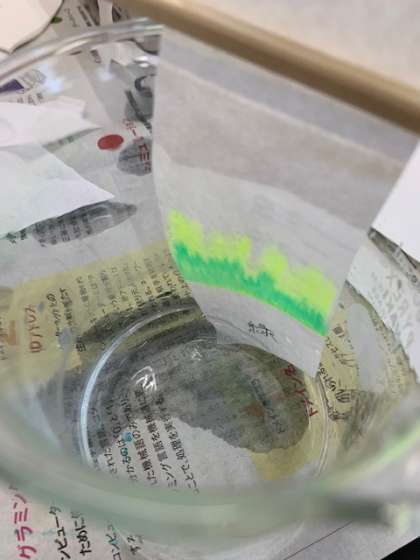 濾紙の先に単色の線を引き、線より下の部分を水に浸けて、しばらく待ってみると・・・