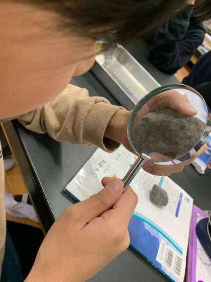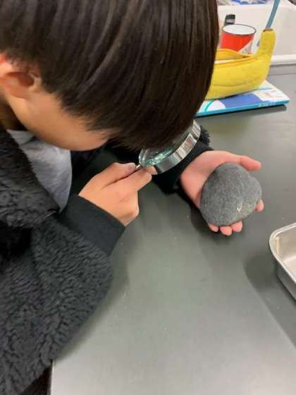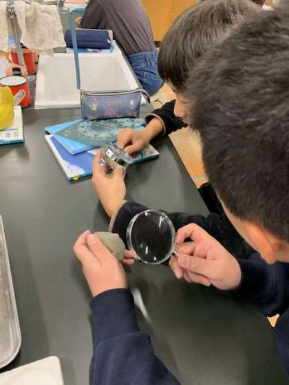 虫眼鏡を使って、れき岩、砂岩、でい岩を区別しました。
