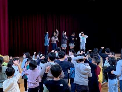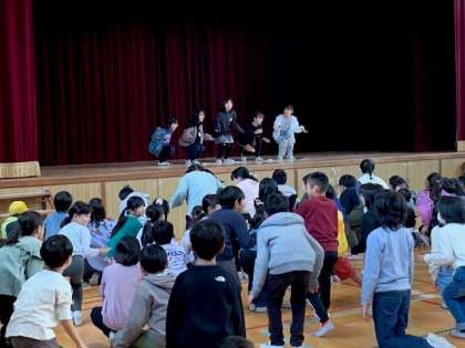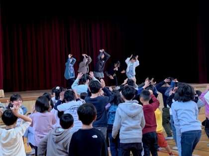 まずは、集会委員がジェスチャーのお手本をみんなに伝授。