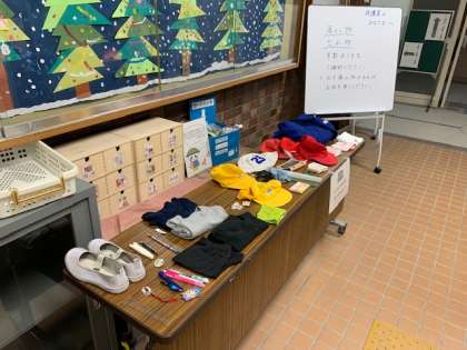 玄関に子どもたちの落とし物、忘れ物を並べています。
