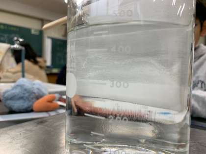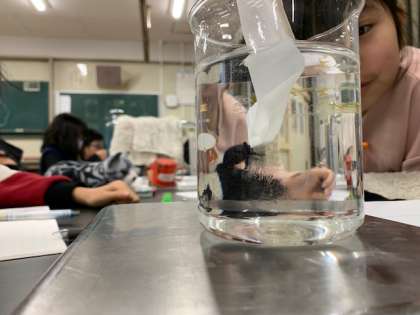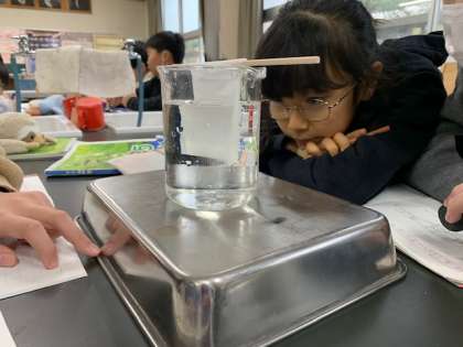 細ーい透明の糸雨が、ビーカー内に降りしきる様子を見ていた子どもたち。
