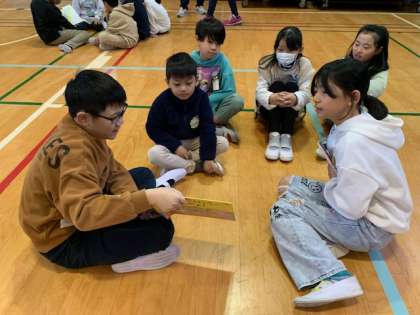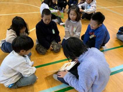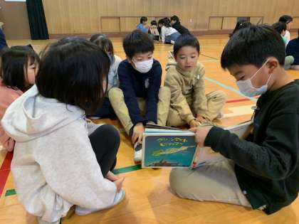 5年生、物怖じすることなく、絵本でメンバーを虜にしています。