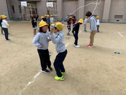友達と先生と、息を合わせて2人跳び。