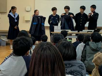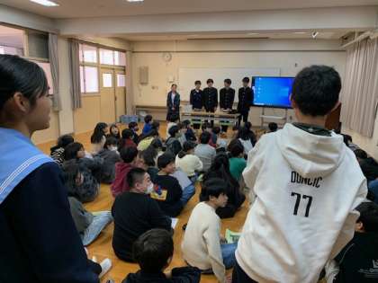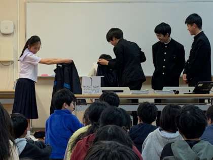 映像だけでなく、実物も提示しながら、学校行事や服装等について、親しみを感じる語りで、分かりやすく説明してくれました。