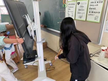 学校をきれいにして卒業しようをめあてに、みなみん班でお世話になった教室などを訪れ、在校生と一緒に清掃活動をしました。