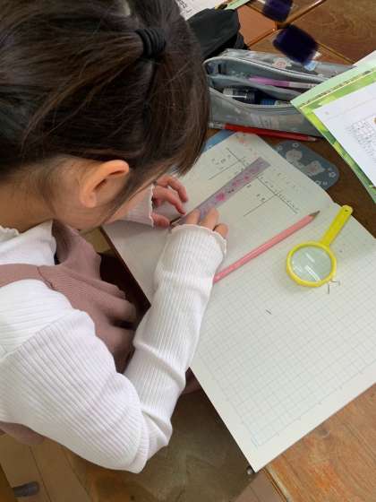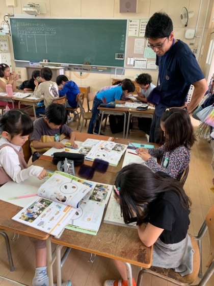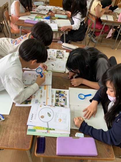 3種類の花の種のちがいを虫眼鏡で観察します。