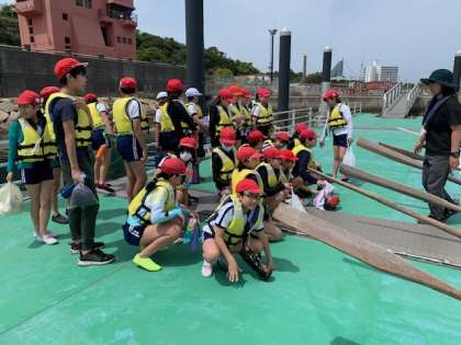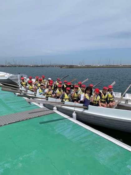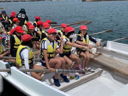今日は、風が少し強いので午前中にカッター体験をする事になりました。みんなで櫂を動かす練習をして準備をします。