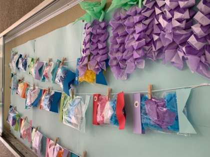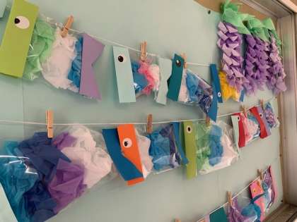学校では、職員室前の掲示板で、おもしろい鯉のぼりたちが列をなして泳いでいます。
