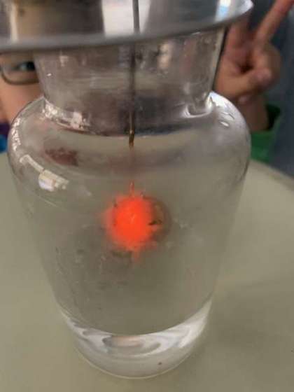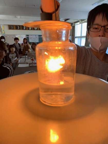 集気瓶の中にアレを充填して、火をつけたスチールウールを入れると・・・