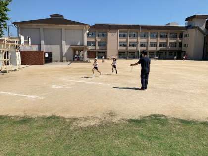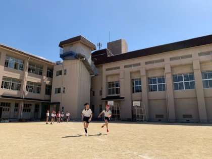 五月晴れの空の下、5時限目の運動場、5年生が50mを疾走中。