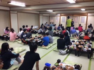 開舎式、避難訓練、入浴を終えて豪華な夕食の時間です。今夜のメニューは、牛肉の陶板焼き、鶏のから揚げ、造り、茶わん蒸し、エビフライなどです。夕食後、ホテル内でお土産を購入する予定です。