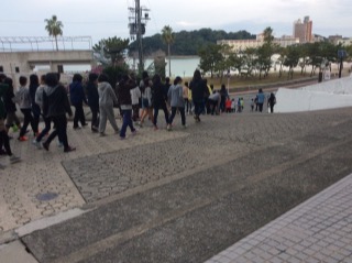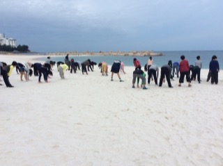 今朝もみんな元気です。朝の集いを白良浜でしました。