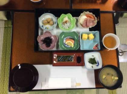 朝食のメニューは、ごはん、汁物、焼き魚、卵焼き、煮物、サラダなどです。