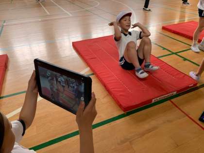 練習の成果を見るために、ペアでお互いに動画撮影。