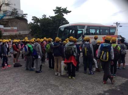 閉舎式を終えて宿舎を出発しました。午前中、天神崎で磯観察などを体験する予定です。