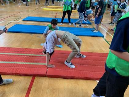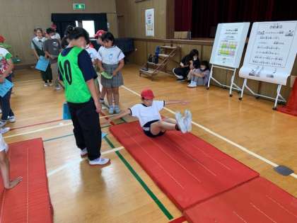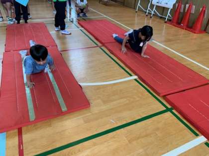 赤色のマットでは、柔軟性や筋力、バランス感覚などを高める運動を行います。