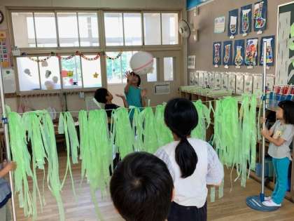風船のバレーボールを打ち合います。