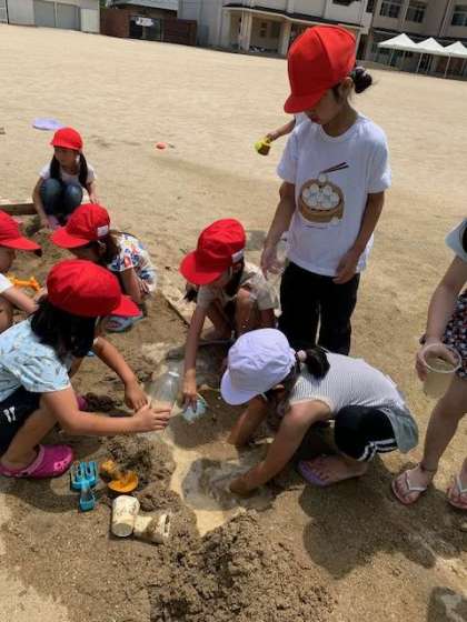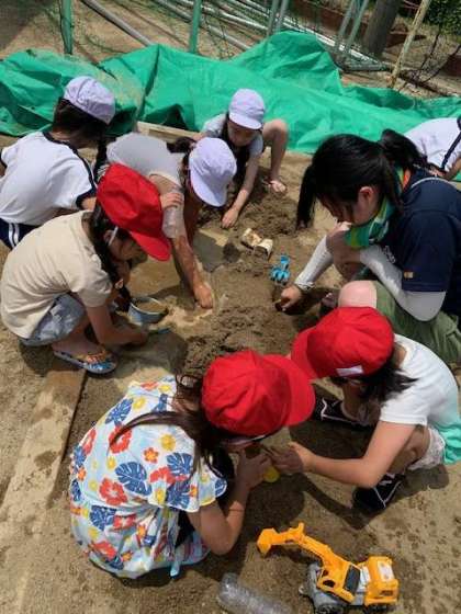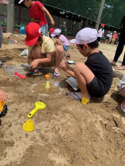 子ども達の仮想世界は留まることを知りません。夢中で、掘って、水を流して、こねてを繰り返していきます。みんな帽子をかぶって夢中で遊んでいるので、誰が誰だかわかりませんでした。おうちの人なら分かるんでしょうね・・・?