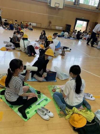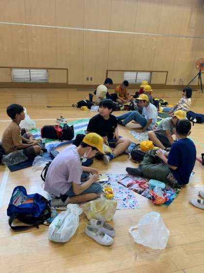 近くの高津小学校の体育館を校長先生のご好意でお借りして、お弁当タイムです。扇風機もあり、蒸し暑くなくて快適でした。みんなほっとした表情でした。