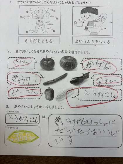 2年生の子どもたちは、いま夏野菜を育てていることもあり、意欲的に栄養学習に取り組みました。