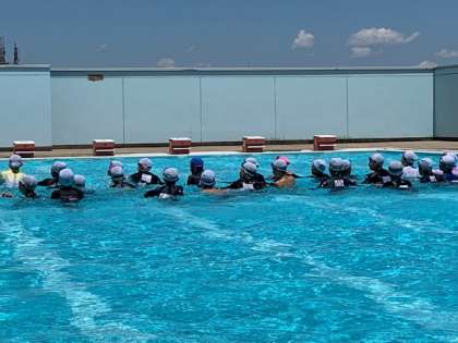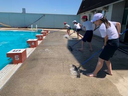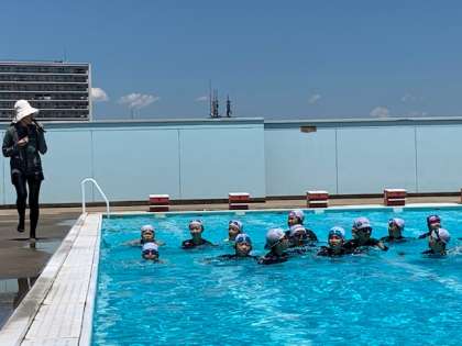 子どもたち、プールの真ん中に集結して、何やら物々しい雰囲気。